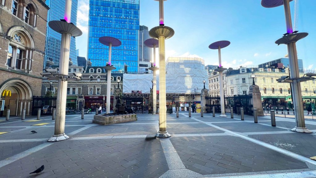 You will enter Broadgate Circle. Walk through Broadgate Circle, enjoying the surroundings. Exit Broadgate Circle and continue on Finsbury Avenue.