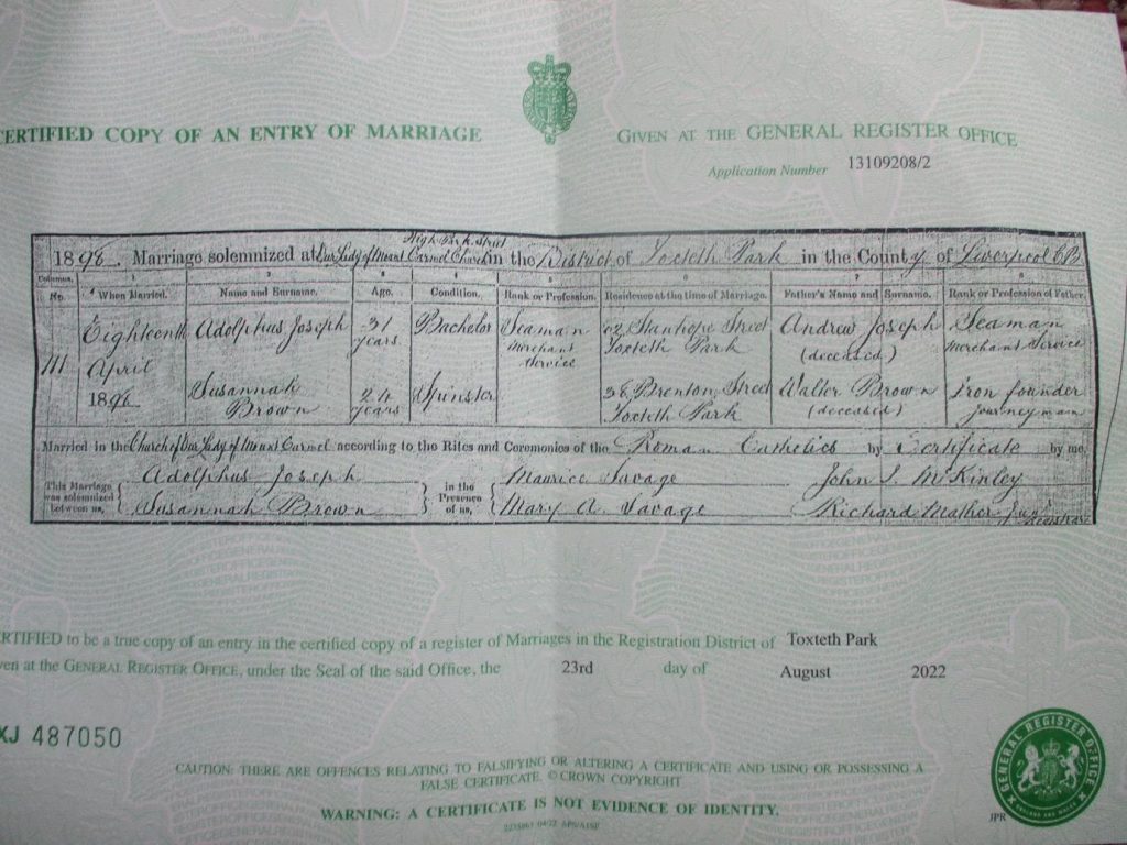 In April 1898 Adolphus Joseph was living in Stanhope Street, Toxteth, just a short distance from Liverpool’s dockland.