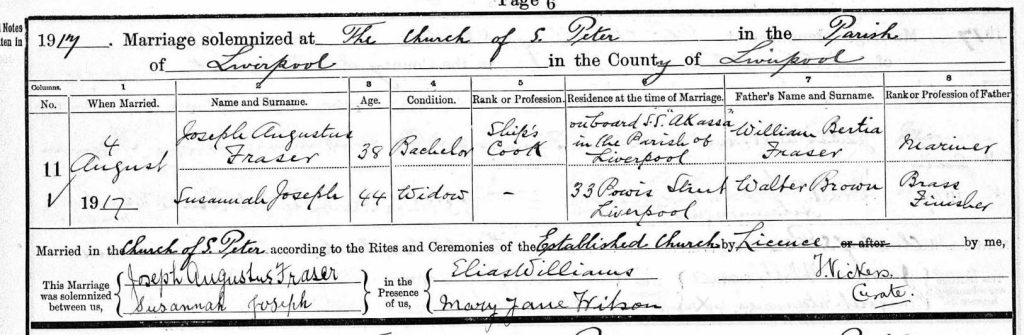 Malvina Fraser and her family continued to live in Liverpool during the First World War and in the year 1917, her mother Susannah was to re-marry. Her new husband was also a seafaring man and he worked as a ship’s cook. His name was Joseph Augustus Fraser. -Fitzrovia London
