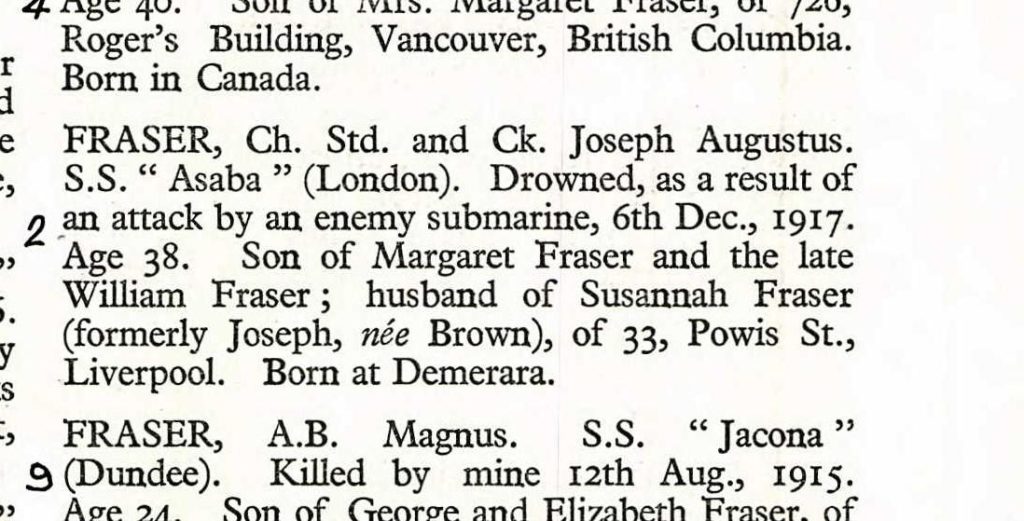 At the time of his marriage, Joseph Augustus Fraser’s address was given as the ship S.S. Akassa, also in the parish of Liverpool. His father, William Bertia Fraser, was a mariner. He was 6 years younger than Malvina’s mother and was born in Demerara, on the north coast of South America.