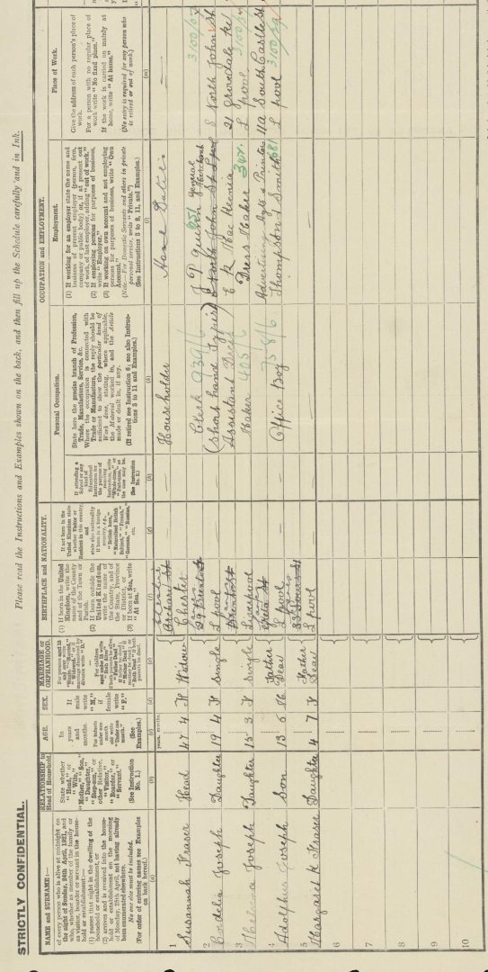 Both the 1901 census and 1911 census documents reveal that Susannah Fraser, then known as Susannah Joseph, worked as a laundress. In 1901 she was living at 39 Greta Street with her one-year-old daughter Amelia. There is no mention of Adolphus Joseph on this document, but given the nature of his work in the merchant navy, he could well have been away from home on the night that the census was taken.
