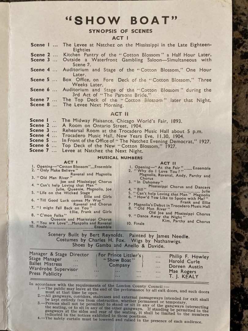 Show Boat was based on Edna Ferber’s best-selling 1926 novel by the same name, and it follows the lives of the performers, stagehands and dock workers on the Mississippi River showboat known as the Cotton Blossom. Its themes included racial prejudice and tragic enduring love. Fitzrovia London