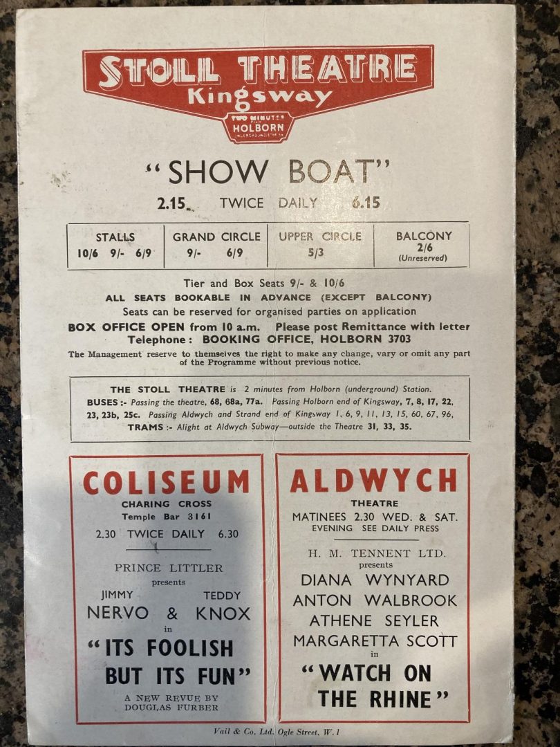 In the year 1943 Malvina Fraser starred in the wartime production of the famous musical Show Boat in London’s West End. Malvina played the part of La Belle Fatima in the show that was performed at the Stoll Theatre in Kingsway.