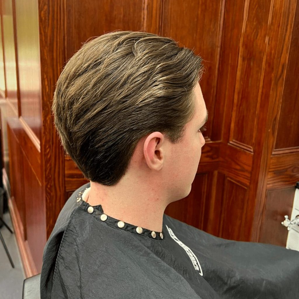 First off, you will need to ask your barber for a scissor cut, leaving around 2-3 inches on the sides. For the neckline, ask for it to be tapered, and ask for the top of the hair to be about 2-3 inches longer than the back and sides. To style, the sides will need to be swept back and top bought back and across to the preferred side for the parting. To maintain this haircut you will need to visit your barber approximately every 4 weeks.