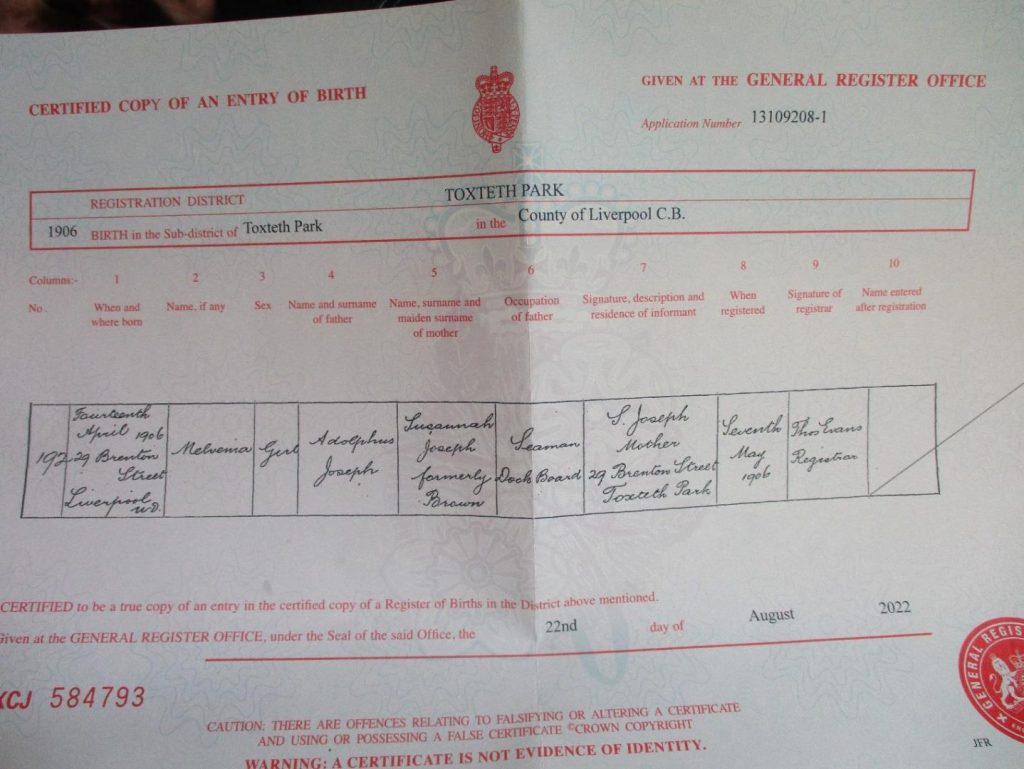 Adolphus Joseph, the father of Malvina Fraser, married Malvina’s mother Susannah Brown on 18 April 1898 at the Lady of Mount Carmel Catholic Church in Toxteth. The Joseph family were a family of seafaring folk, with Adolphus Joseph’s father Andrew Joseph also having worked on the Liverpool docks as a merchant seaman, just as Adolphus Joseph was doing at the time of his marriage. London