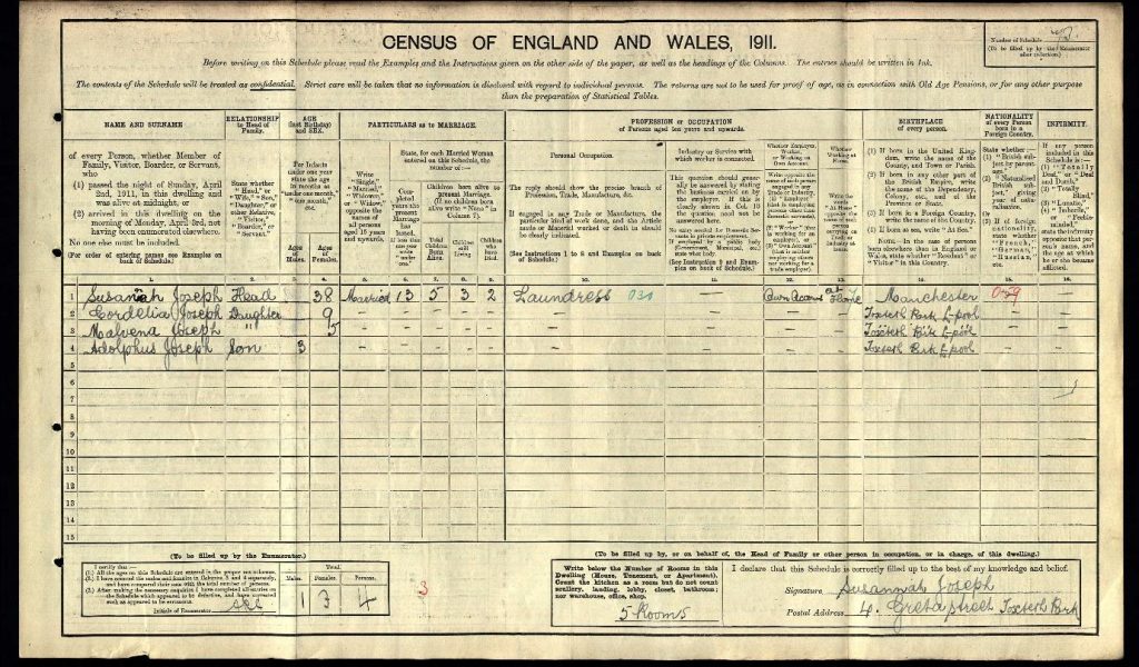 By the year 1911 Susannah Joseph was living at 4 Greta Street in Toxteth. By now she had given birth to five children but only three of these were still alive. The three children who survived childhood were Cordelia Joseph aged 9, Malvina Joseph (on the 1911 document spelt Malvena) aged 5 and Adolphus Joseph aged 3. Once again there was no sign of her husband Adolphus Joseph living at the house but the 1911 census does say that the couple were still married. – London’s West End