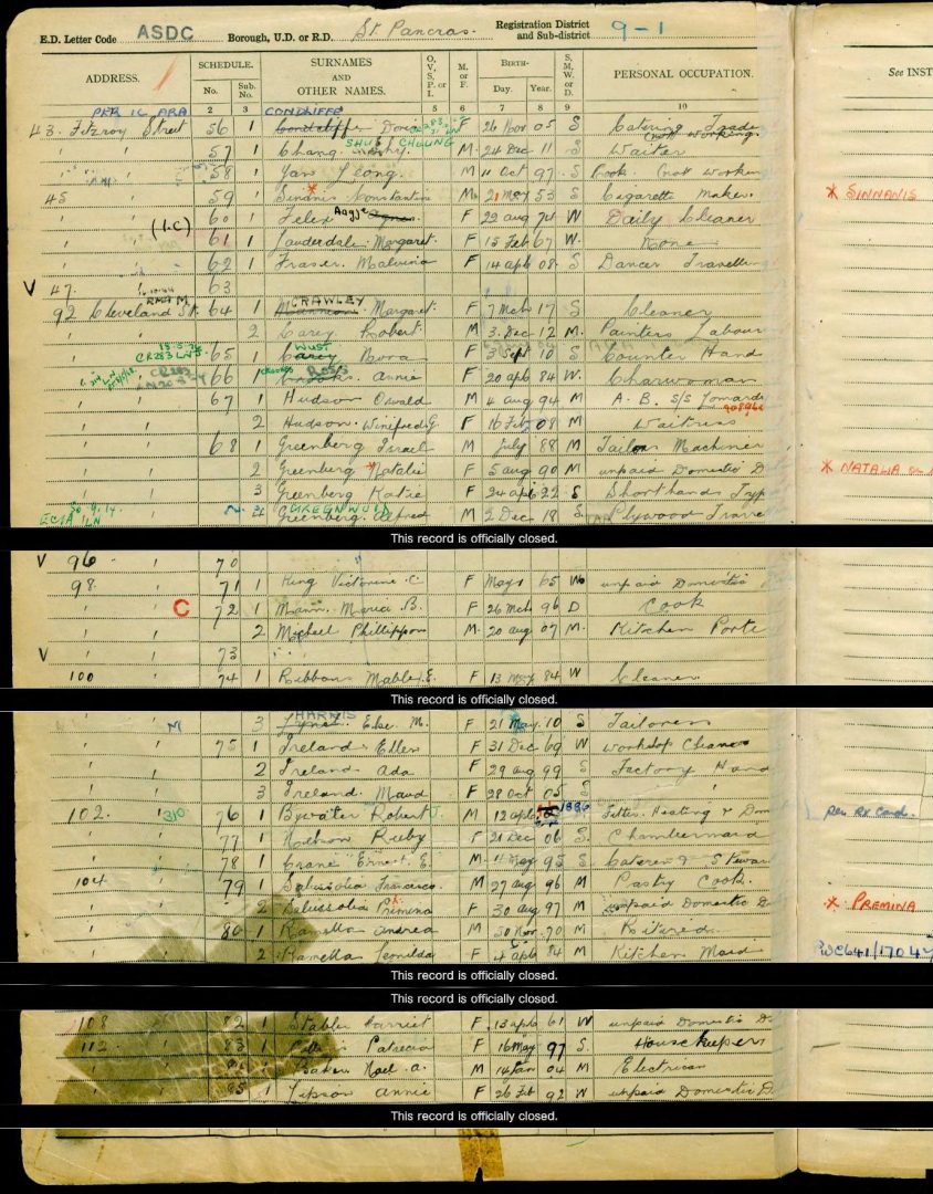 At the time of the outbreak of the Second World War Malvina was sharing the upstairs premises at 45 Fitzroy Street with, amongst others, a cigarette maker by the name of Sinnanis Constantine. Two other ladies also lived above the Fitzrovia cafe at this point in history, one of whom was a cleaner. Fitzrovia London | University College London