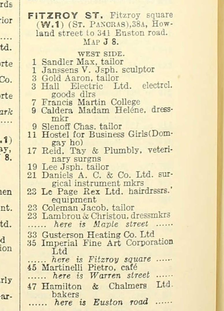 Malvina Fraser continued to live in Liverpool Street until the mid-1930s when she then moved to 45 Fitzroy Street in Fitzrovia London.