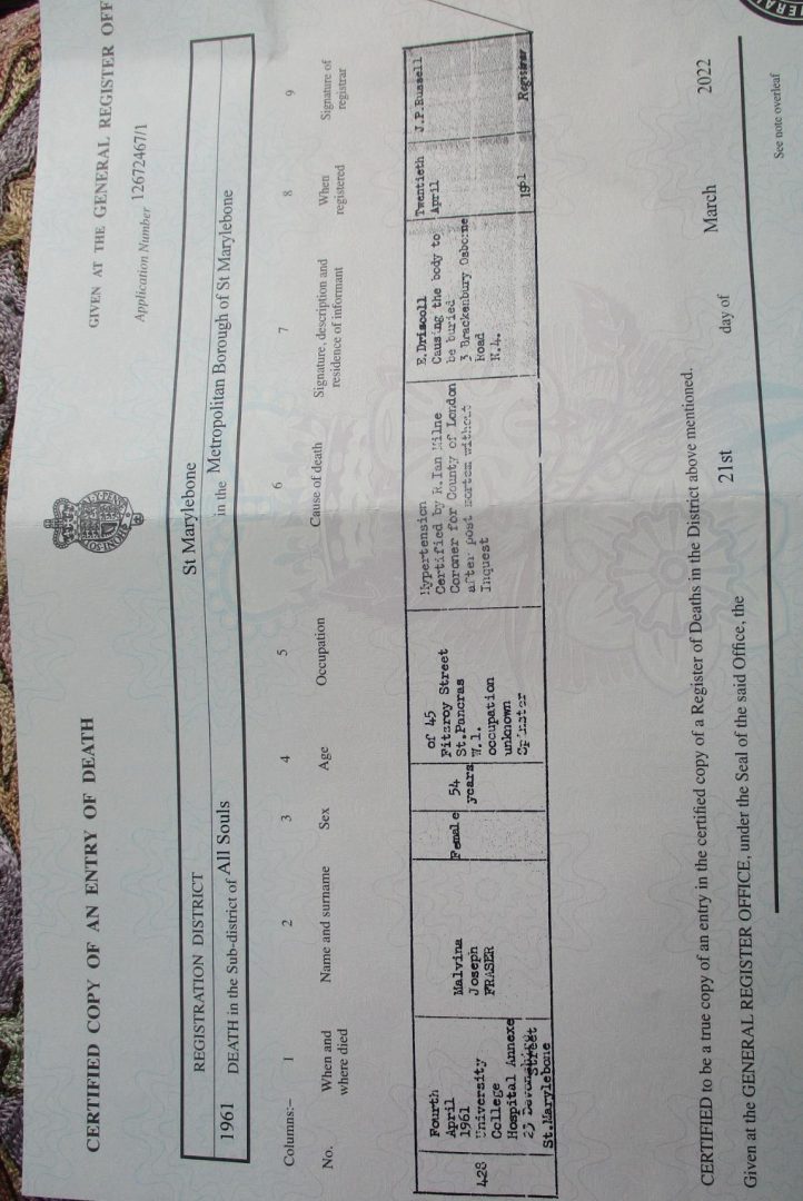 Malvina Fraser passed away on the 4th of April 1961 at the nearby University College Hospital. She was 54 years old, with the cause of death being given on her death certificate as hypertension.