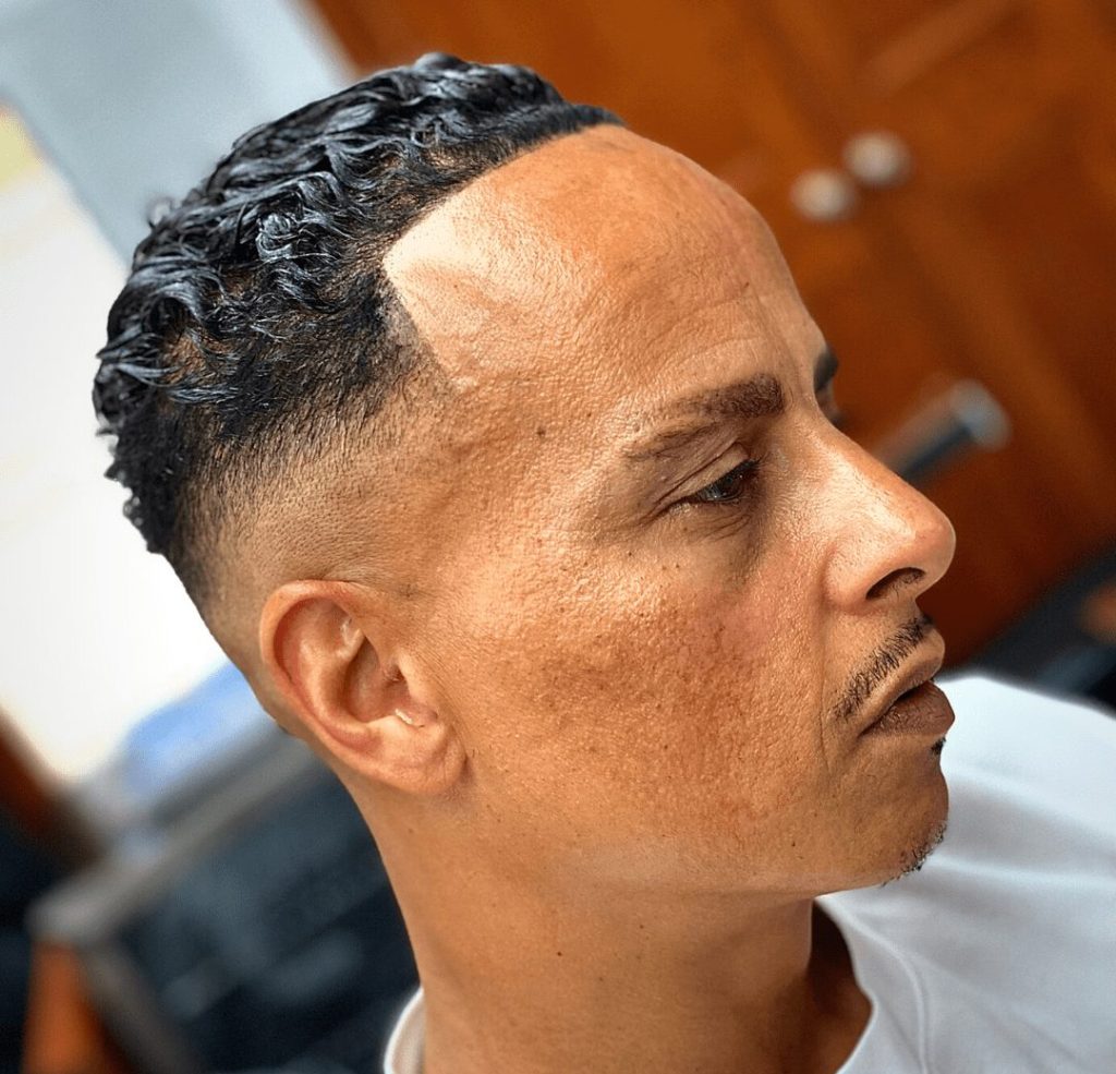 A taper fade (also known as a shadow fade) with waves works particularly well on Afro-Caribbean or thick, curly hair. How short you go is between you and your barber, but the key to this men’s fade is the seamless blending between the top and sides. Don’t forget your beard if this one makes it to your shortlist – to really nail it, the fade needs to be blended into your sideburns as well. The precision of the cut means you need to stay on top of your barber visits, but the good news is that it’s easy to maintain between appointments. Pretty much all you need is a nice shampoo, conditioner and a comb or soft-bristled brush to deal with rogue strays.