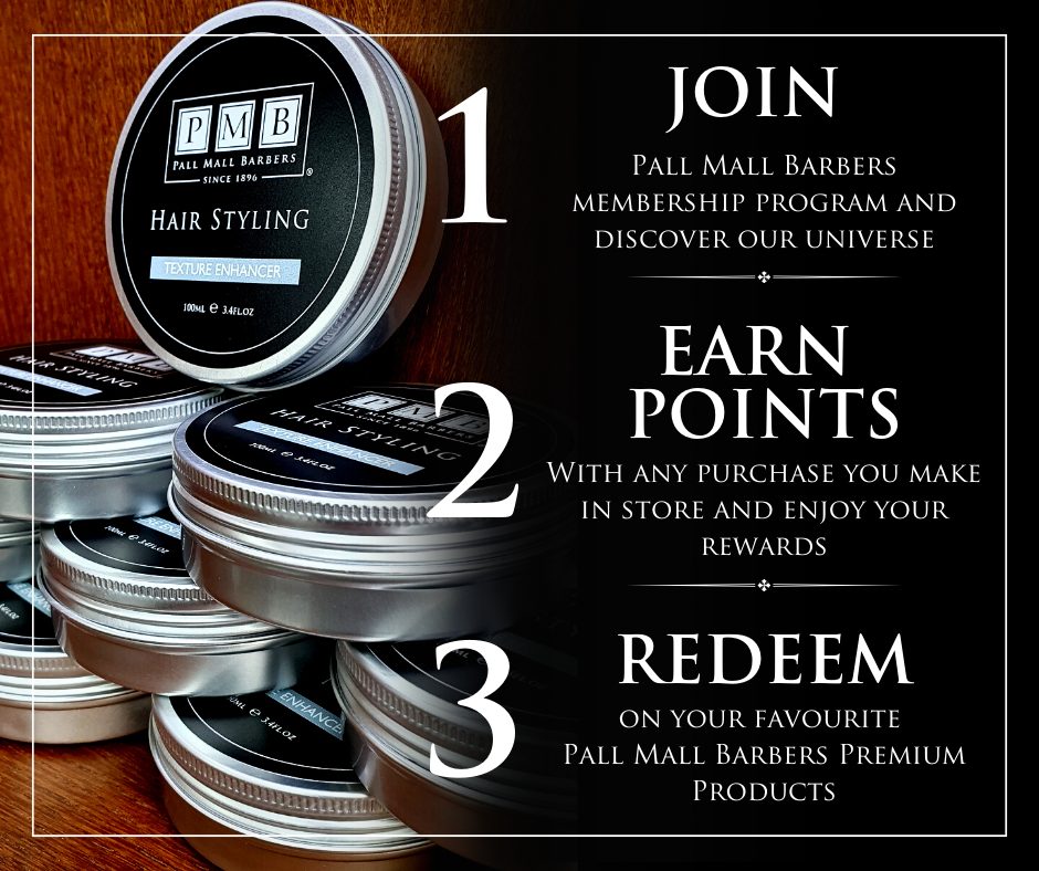Enrolment: Membership is free and automatically granted upon making a purchase at a Pall Mall Barbers store. Participants must book online under their registered account to earn points.